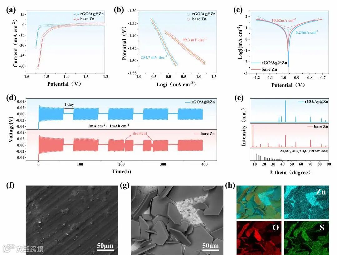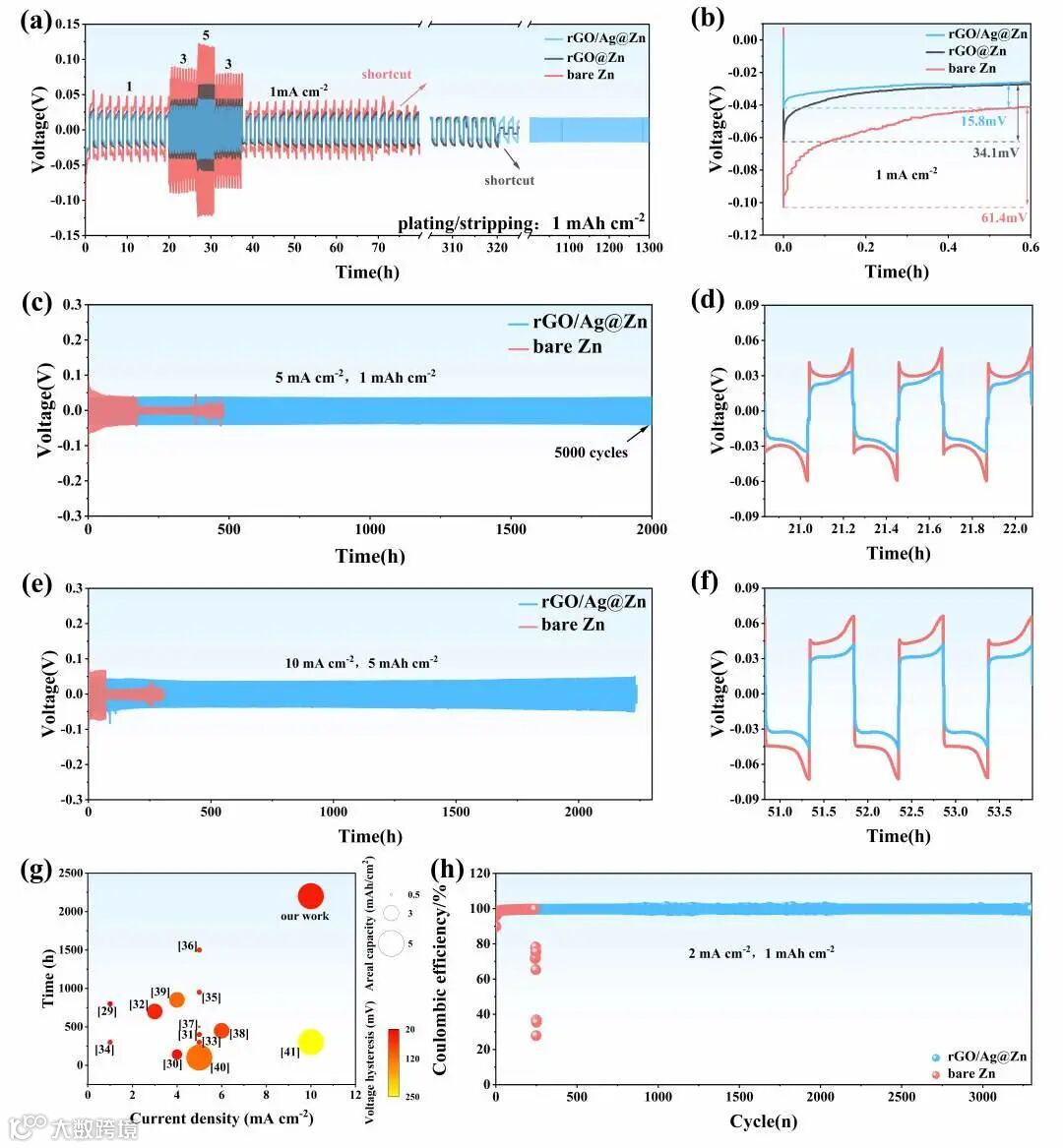通过组装对称电池进行电化学性能测试可以看出,无论在哪个电流密度下,其改性后的锌负极极化电压和形核过电位都得到了明显的改善。同时在大电流和大容量下的长循环也展示了更长的寿命和稳定性。而组装的半电池也具有更高更稳定的长循环库伦效率。特别地,借助于rGO/Ag人工界面层,在电流密度为5mA cm-2和面容量为1mAh cm-2条件下,rGO/Ag@Zn为电极的对称电池显示了超过5000次的稳定电镀/剥离过程,同时极化电压仅为33.1 mV。当电流密度增大到10mA cm-2并在较高的面容量(5mAh cm-2)下时,rGO/Ag@Zn仍可以稳定地工作2200h,同时具有仅为41.8 mV的超低极化电压。