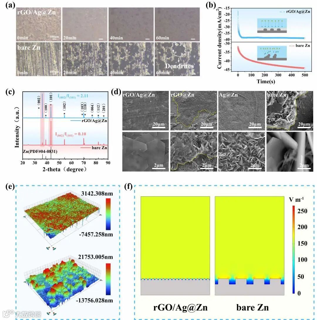 对沉积形貌进行分析,解析其较好电化学性能的原因。如图中SEM所示,没有修饰的锌负极出现大量枝晶和杂乱堆积。而仅有纳米银颗粒修饰的锌负极虽然沉积更为均匀,但是锌片呈现竖直生长;仅有还原氧化石墨烯修饰的锌负极则相反,有平行于基底的取向生长,但是也只是局部的沉积。将二者结合起来则能实现均匀且平行于基底表面的取向生长,实现了1+1>2的效果。这也是其能承受大电流大容量的原因。其次就是更多的表征来验证其沉积均匀性和取向生长的表征。包括表面原位光学显微镜,计时电流法,白光干涉光学轮廓,有限元模拟等都证明了改性后的极片沉积更为均匀,同时沉积后的锌的XRD 也证明了其延(002)晶面的取向生长情况。