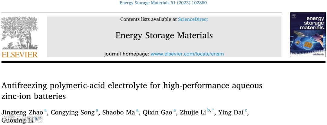 Jingteng Zhao, Congying Song, Shaobo Ma, Qixin Gao, Zhujie Li*, Ying Dai, Guoxing Li*, Antifreezing polymeric-acid electrolyte for high-performance aqueous zinc-ion batteries, Energy Storage Materials, 2023.