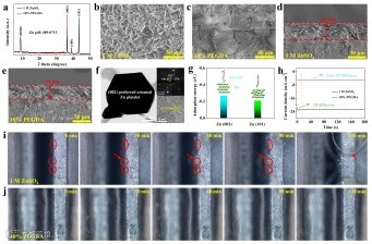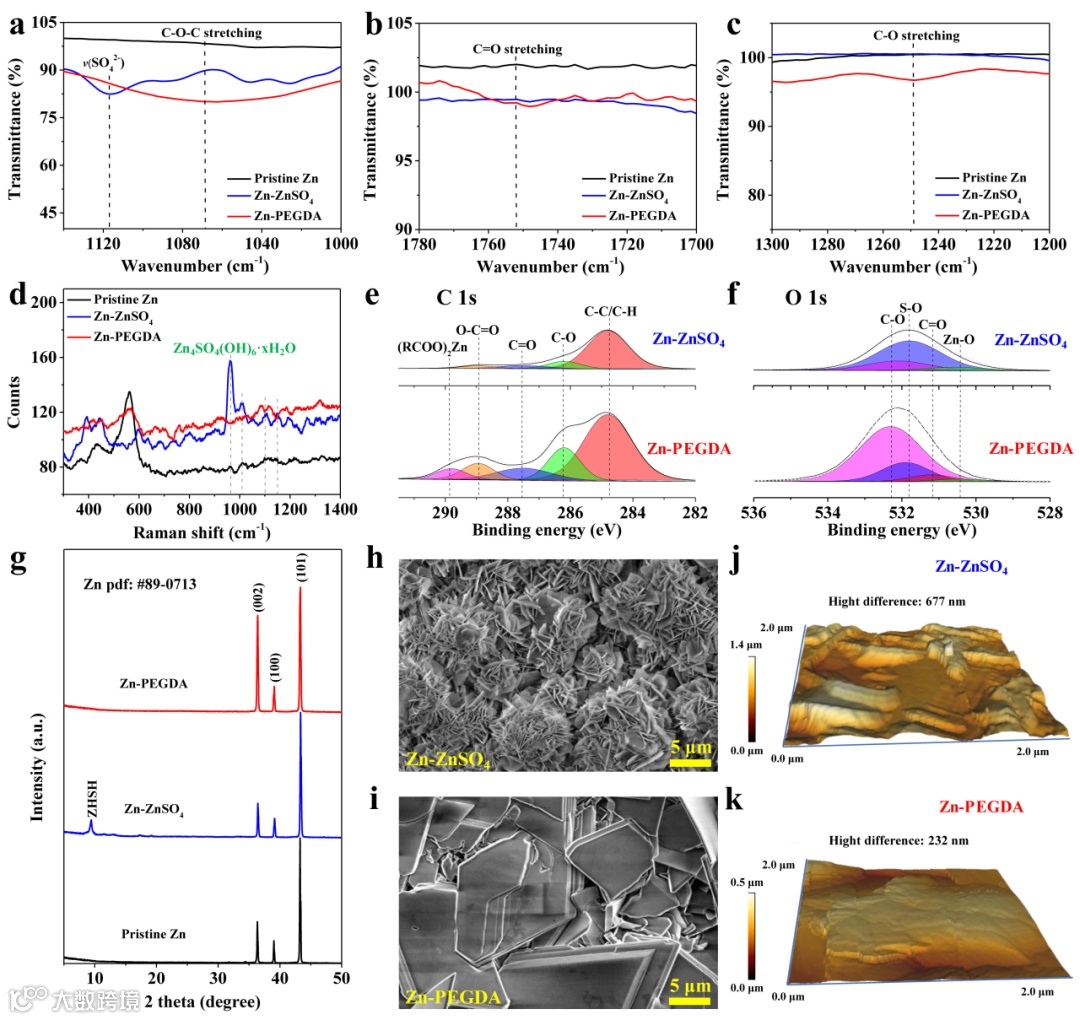 PEGDA可以消除与OH-相关的Zn负极表面钝化,且在其表面原位形成有利的交联聚合型固体/电解液界面(SEI, -ZnOOC-PEG-COOZn-)。该稳定的SEI阻断了强酸性电解液与Zn金属的进一步反应,并使Zn(002)晶面优先暴露。