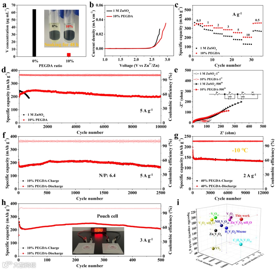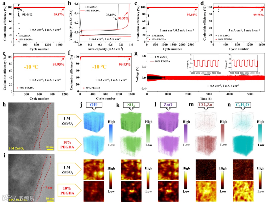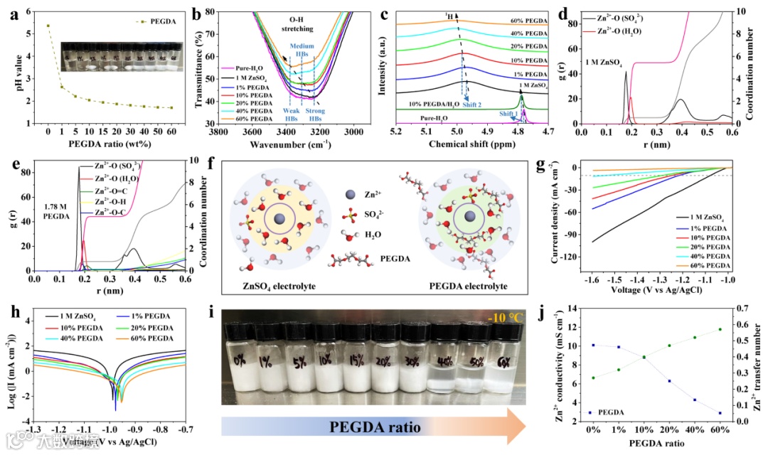 PEGDA不仅提供强酸性环境而且使Zn2+形成核壳状溶剂化结构,这限制了H2O的活性并减轻了其分解引起的副反应。此外,PEGDA与H2O之间的氢键降低了电解液的冰点,使其能够在零度以下工作