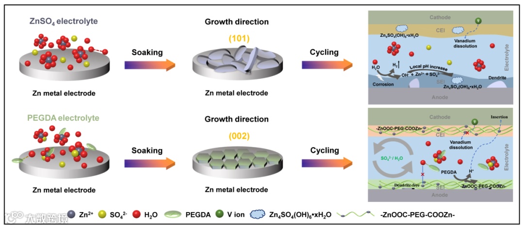 图 1. ZnSO4(上)和PEGDA电解液(下)中Zn2+溶剂化结构、相应Zn2+沉积行为以及负/正极表面化学的示意图。