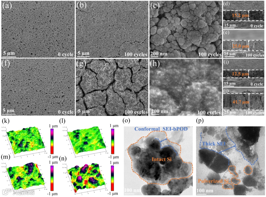 图7 a) Si- bPOD和f) Si循环前SEM俯视图; b,c) Si- bPOD和g,h) Si循环100次后SEM俯视图; d) Si- bPOD和i) Si循环前SEM横截面图; e) Si- bPOD和j) Si循环100次后SEM横截面图;k) Si- Si- bPOD和m) Si循环前AFM三维形貌;l) Si- bPOD和n) Si循环100圈后AFM三维形貌;(o) Si-bPOD (p) Si循环100圈后TEM图.