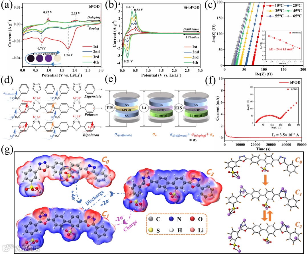 图4. a) bPOD和b) Si-bPOD电极的CV曲线;c) EIS测试(插图为Li+通过bPOD膜的活化能);d) bPOD本征态、极化子态和双极化子态的分子结构和电导;e) bPOD在本征态和掺杂态的电导率分解和分析程序;f) bPOD在掺杂状态下的时间-电流曲线(插图为bPOD在掺杂