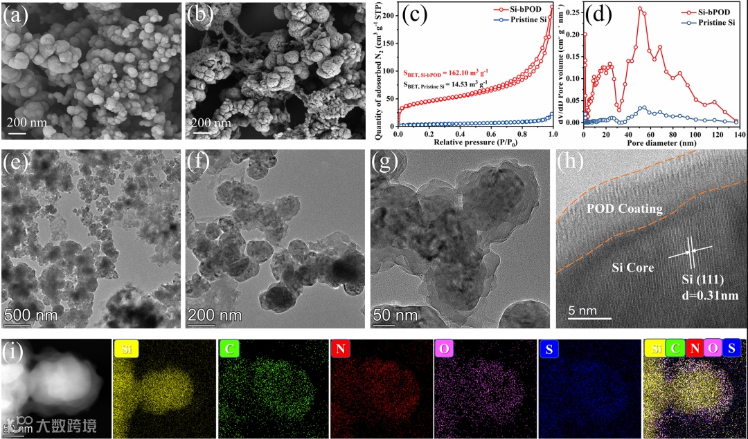 图3. SEM图像a) Si;b) Si-bPOD;c) N2吸附/解吸等温线;d) 孔径分布;e-h) 低分辨率和高分辨率的TEM图像;i) STEM-EDS元素映射