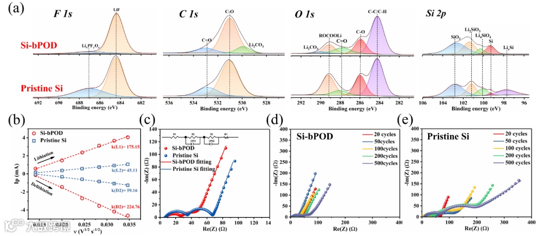 图6 a) 50次循环后Si- bPOD和Si电极的XPS光谱; b) 峰值电流(Ip)与电位扫描速率平方根的关系; c) 20次循环后Si- bPOD和Si负极的EIS图谱; d) Si- bPOD和e) Si负极不同循环圈数下的EIS测试。