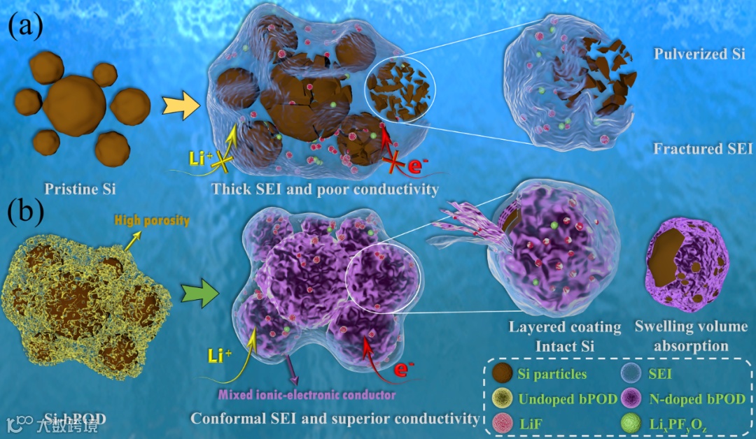 图1. 电极稳定性和SEI结构示意图。a)纯Si,SEI层厚且不均匀;b)导电多孔bPOD包覆硅,形成稳定均匀的SEI