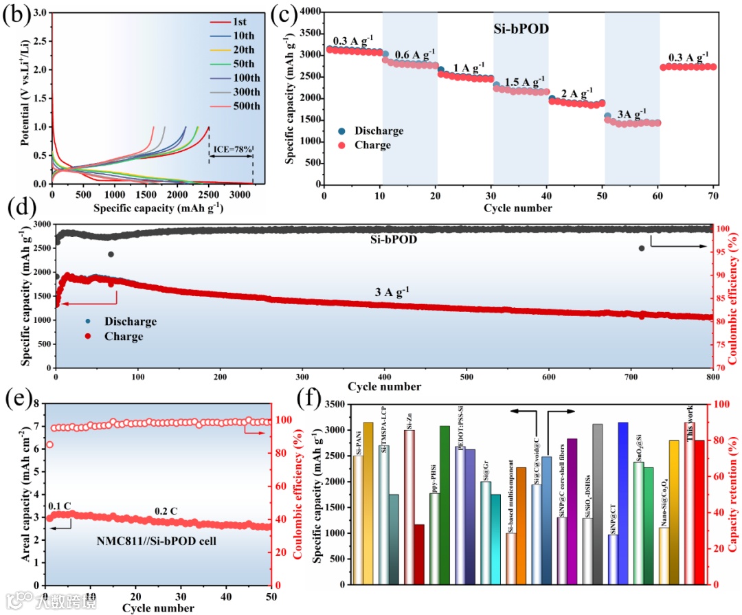 本文,他们通过聚联苯噁二唑(bPOD)上的磺酸基团与Si上的羟基反应,在Si颗粒上设计了具有三维分层多孔结构的双离子电子导体涂层(图1b)。与碳涂层的“点对点”通道相比,硅表面均匀且n掺杂的聚合物导电层与硅颗粒 “面对面”紧密接触,一方面能够钝化活性硅-电解质界面,另一方面还能促进负极的连续离子/电子传递。针对硅粉电导率较差的情况,bPOD粘结剂突出的离子-电子运输耦合效应可以显著提高硅负极的倍率性能。特别是在bPOD被n掺杂后,电子导电性显著提高,有效地避免了厚电极的极化,延长了电池的寿命。此外,bPOD涂层由于其柔韧性和优异的强度以及三维分层多孔结构的优点,足以缓解电化学循环过程中Si的应力和体积变化。特别是,bPOD可以通过抑制Si直接暴露于电解质来控制SEI的形成,从而避免了锂离子的持续消耗。此外,bPOD的噁二唑上的N基团与氟代碳酸乙烯酯(FEC)的偶极-偶极相互作用的能力,可以促进LiF的形成,这已被证明有利于锂离子的运输。bPOD涂层的硅具有优异的循环性能,在1 A g−1下循环500次后可逆比容量超过1600 mAh g−1,在3 A g−1下具有超过1500 mAh g−1的优异倍率能力,这得益于bPOD独特的结构和出色的混合离子电子导电性。这种巧妙的聚合物涂层设计也适用于其他电极,如SiO,SiC, S等,这些电极在循环过程中电导率低且体积变化剧烈的材料。