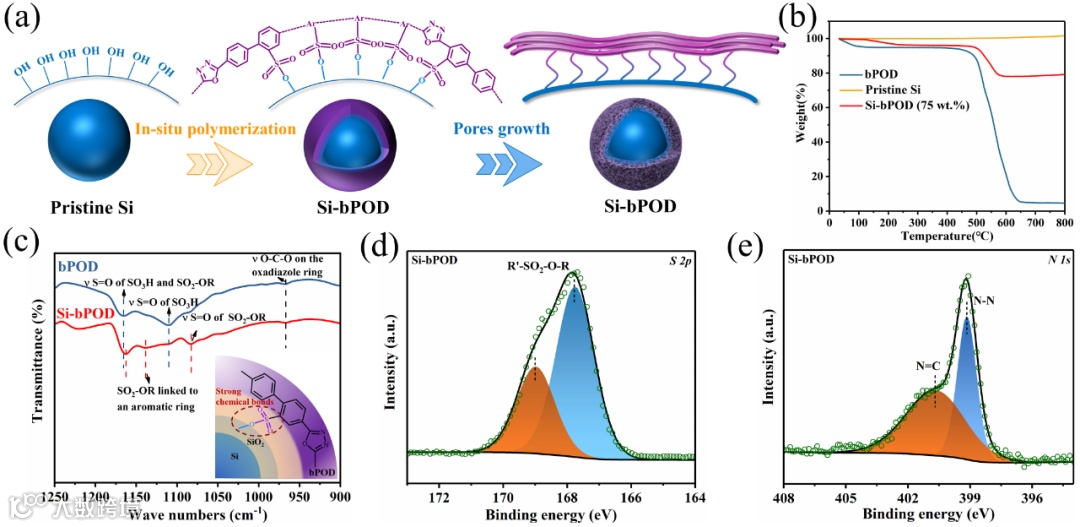 图2. Si-bPOD的独特设计与结构表征。a) bPOD层包覆Si电极示意图;b) 热重曲线;c) 红外光谱;Si-bPOD的XPS: d) S 2p谱,e) N 1s谱