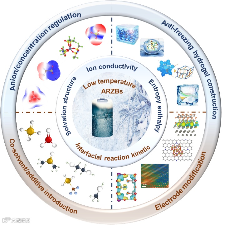 图1:此综述提出了水分子凝固结冰的基本原理以及水系电解液凝固导致的可充锌电池在低温条件下面临的挑战。强调了离子/浓度调控策略、混合溶剂/添加剂策略、抗凝固水凝胶设计与制备策略以及电极材料修饰策略,并总结各策略所取得的成果,最后对未来低温可充锌电池的研究提出展望。