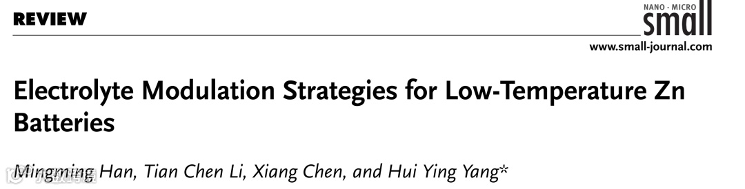 近日,浙江师范大学韩明明与新加坡科技与设计大学杨会颖教授合作,在国际知名期刊“Small”上发表了题为“Electrolyte Modulation Strategies for Low-temperature Zn Batteries”的综述文章。该综述讨论了水系锌电池在低温环境下面临的挑战,总结了常规水系电解液调控原则以及新型抗低温电解液设计原理,强调了在多种策略改性下的水系可充锌电池取得的性能上的提高,指出了未来低温锌电池面临的挑战并为高性能电解液的设计与发展提供了研究思路。