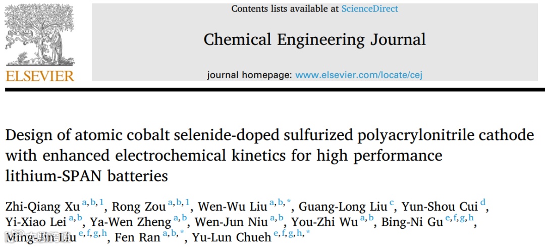 近日,来自兰州理工大学的刘文武副研究员、冉奋教授与台湾国立清华大学的阙郁伦教授及金川镍钴新材料技术创新中心刘广龙高级工程师合作,在国际知名期刊Chemical Engineering Journal上发表题为“Design of atomic cobalt selenide-doped sulfurized polyacrylonitrile cathode with enhanced electrochemical kinetics for high performance lithium-SPAN batteries”的观点文章。该观点文章以单原子级硒化钴负载硫化聚丙烯腈高聚物为研究对象,探讨了Co负载对SPAN还原储锂过程中亲核试剂S2–的HOMO能级与亲电试剂Li+的LUMO能级匹配度,及其对锂-有机硫电池还原沉积动力学及电化学性能的影响机制。