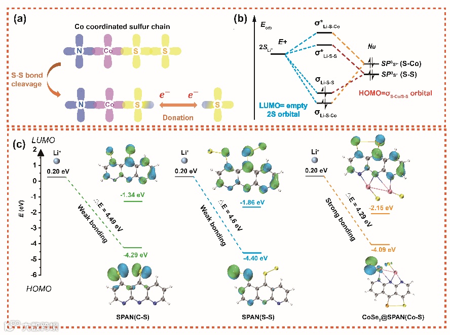 图1. (a-b) S-Co键断裂过程中S原子的电子迁移与Li+和S2-之间的轨道杂化; (c) 前线分子轨道理论计算的SPAN、和CoSe2@SPAN的LUMO和HOMO能级。