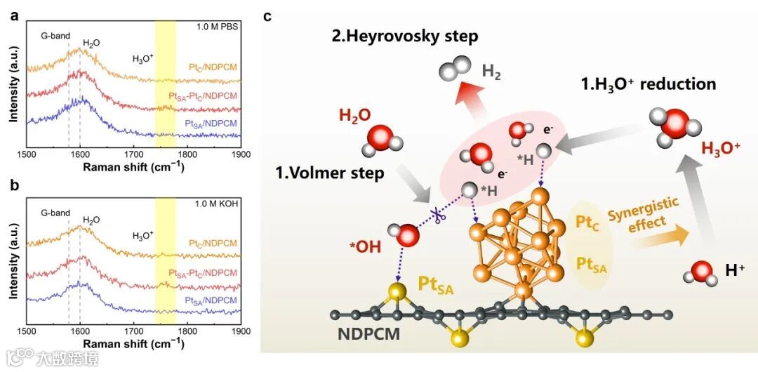 图5 PtC/NDPCM、PtSA-PtC/NDPCM、PtSA/NDPCM在-30 mA cm-2下在(a) 1.0 M PBS和(b) 1.0 M KOH中的拉曼光谱;(c) PtSA-PtC/NDPCM的HER过程的机制示意图。