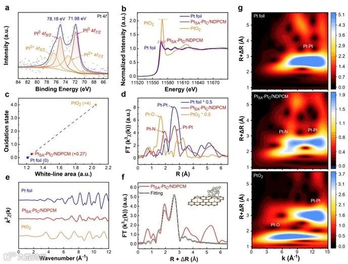 图2 (a) PtSA-PtC/NDPCM的Pt 4f轨道的高分辨率XPS光谱;(b) Pt箔、PtSA-PtC/NDPCM和PtO2的归一化Pt L3边的XANES光谱;(c) 从PtSA-PtC/NDPCM的ΔXANES光谱以及作为参考的Pt foil和PtO2的光谱计算出的Pt氧化态;(d) Pt箔、PtSA-PtC/NDPCM和PtO2中相应的k3-weight FT-EXAFS,没有相位校正;(e) PtSA-PtC/NDPCM在Pt L3边的K空间和(f) R空间的EXAFS拟合曲线;(g) Pt箔、PtSA-PtC/NDPCM和PtO2的小波变换图。