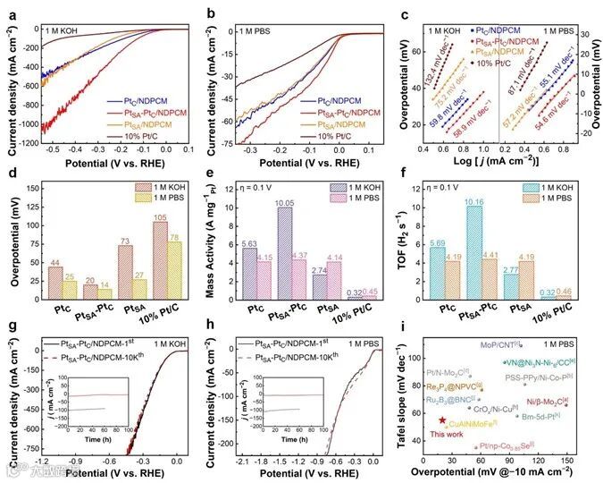 图3 PtC/NDPCM、PtSA-PtC/NDPCM、PtSA/NDPCM和10% Pt/C在 (a) 1.0 M KOH和 (b) 1.0 M PBS中的极化曲线;(c) 从相应的LSV曲线得到的PtC/NDPCM、PtSA-PtC/NDPCM、PtSA/NDPCM和10% Pt/C的Tafel图;(d) 各种催化剂在1.0 M KOH和1.0 M PBS中达到-10 mA cm-2所需的过电位;(e) 在1.0 M KOH和1.0 M PBS中,η = 100 mV时,催化剂的质量活性;(f) 在1.0 M KOH和1.0 M PBS中η = 100 mV的TOF图;(g) PtSA-PtC/NDPCM在1.0 M KOH中以10 mV s-1的扫描速率在-0.1和-0.5 V之间进行10,000次CV扫描之前和之后的极化曲线。插入图:PtSA-PtC/NDPCM在j = -10和-100 mA cm-2时分别进行的i-t测试;(h) PtSA-PtC/NDPCM在1.0 M PBS中以10 mV s-1的扫描速率在-0.1和-0.5 V之间进行10,000次CV扫描之前和之后的极化曲线。插入图:PtSA-PtC/NDPCM分别在j = -10和-100mA cm-2时的i-t测试;(i) PtSA-PtC/NDPCM在1.0 M PBS中的HER活性与其他催化剂的比较。
