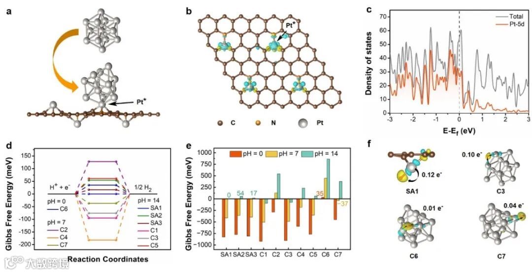 图4. (a) 孤立的Pt13团簇和几何优化后的PtSA-PtC/NDPCM的原子结构;(b) 嵌入Pt前后的差分电荷密度;(c) PtSA-PtC/NDPCM的态密度和Pt-5d轨道的投影态密度。(d, e) ΔGH*在PtSA-PtC/NDPCM在10个位点上HER催化过程中的变化;(f) SA1, C3, C6和C7位点上Pt原子向吸附的H原子转移的示意图。