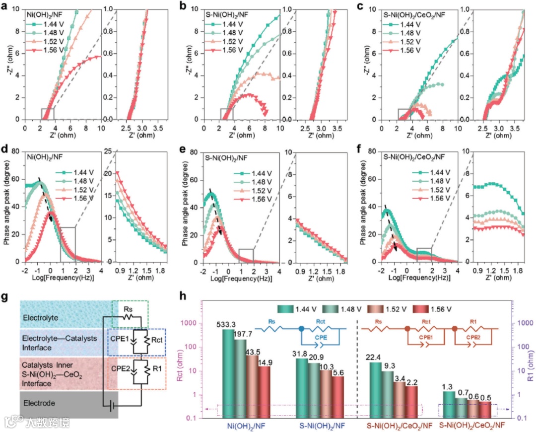 图2:a、b、c)Ni(OH)2/NF、S-Ni(OH)2/NF和S-Ni(OH)2/CeO2/NF电极分别在不同电位(1.44、1.48、1.52 和 1.56 V vs. RHE)下的Nyquist图;d、e、f)Bode相曲线;g)S-Ni(OH)2/CeO2/NF的电极结构和等效电路图;h)Ni(OH)2/NF、S-Ni(OH)2/NF和S-Ni(OH)2/CeO2/NF电极在不同电位下的Rct和S-Ni(OH)2/CeO2/NF电极的R1的拟合数据。