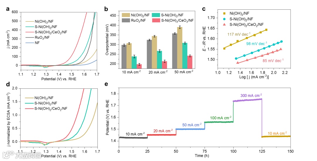 图1:a)NF、RuO2/NF、Ni(OH)2/NF、S-Ni(OH)2/NF和S-Ni(OH)2/CeO2/NF电极的OER LSV曲线;b)电流密度为10、20和50 mA cm-2时的过电位;c)稳态Tafel图;d)ECSA归一化后的LSV曲线;e)S-Ni(OH)2/CeO2/NF的OER稳定性。