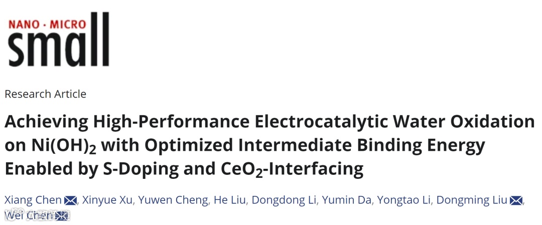 近日,安徽工业大学陈翔博士、柳东明教授和新加坡国立大学陈伟教授在国际期刊Small上发表了题为”Achieving High-Performance Electrocatalytic Water Oxidation on Ni(OH)2 with Optimized Intermediate Binding Energy Enabled by S-Doping and CeO2-Interfacing”的文章。该工作通过一步水热法在泡沫镍原位合成了一种具有纳米棒状阵列结构的S掺杂的Ni(OH)2与CeO2复合的催化剂(S-Ni(OH)2/CeO2/NF)。根据系统表征、电化学测量和理论计算的结果,发现通过S掺杂和CeO2界面作用可调节Ni(OH)2的形貌和电子结构,从而大幅提高Ni(OH)2的OER活性,降低电荷转移电阻,增加暴露的活性位点,并优化OER中间体的结合能。这种Ni基电极S-Ni(OH)2/CeO2/NF在电流密度为10 mA cm-2时,过电位低至196 mV,同时,S-Ni(OH)2/CeO2/NF(+) || S-Ni(OH)2/NF(-)两电极装置具有优异的电催化全解水性能,达到10 mA cm-2的电流密度,电解槽电压仅需1.51 V。这项研究提出了一种简便高效的掺杂和界面策略,以优化Ni基电催化剂实现高效水分解。