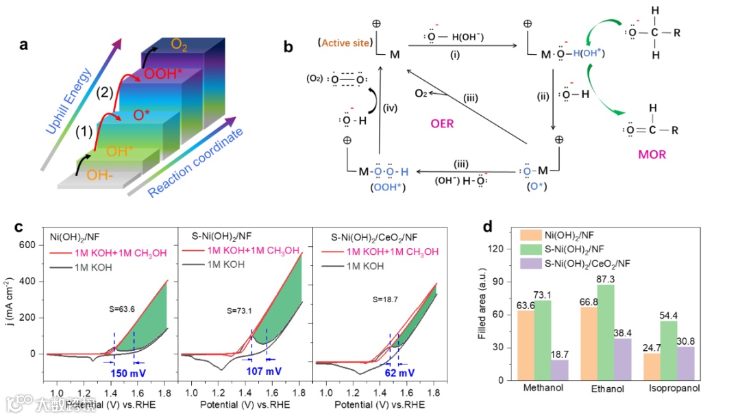 图3:a) OER过程中金属(氧)氢氧化物的中间体吸附能示意图(步骤1或2表示Ni(氧)氢氧化物催化剂可能的RDS)。b) OER和MOR过程。c) Ni(OH)2/NF、S-Ni(OH)2/NF和S-Ni(OH)2/CeO2/NF电极在1 M KOH和1 M甲醇条件下的CV图。绿色区域表示由MOR引起的电流差。d) 不同亲核醇分子(甲醇、乙醇和异丙醇)催化氧化反应的绿色区域面积。