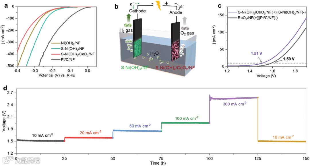 图4:a)Pt/C/NF、Ni(OH)2/NF、S-Ni(OH)2/NF和S-Ni(OH)2/CeO2/NF电极的HER LSV 曲线;b)以S-Ni(OH)2/CeO2/NF和S-Ni(OH)2/NF分别作为阳极和阴极(S-Ni(OH)2/CeO2/NF(+) || S-Ni(OH)2/NF(-))的双电极全解水装置示意图;c)S-Ni(OH)2/CeO2/NF(+) || S-Ni(OH)2/NF(-)和RuO2/NF (+) || Pt/C/NF (-)装置的电催化全解水LSV曲线;d)S-Ni(OH)2/CeO2/NF(+) || S-Ni(OH)2/NF(-)全解水稳定性测试。
