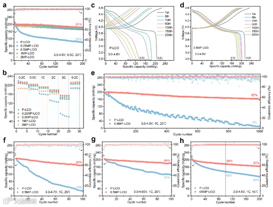 改性后,0.5MP-LCO样品表现出出色的循环稳定性,在截止电压为4.6V时,1 C循环1000次后容量保持率仍达到82%。在更高的电压和温度等极端条件下,0.5MP-LCO也表现出优异的性能。在高截止电压为4.7时,0.5MP-LCO经过100次循环后分别展现出83%的容量保持率,远优于P-LCO的14%。此外,在45°C下,在4.6 V下经过100次循环后,0.5MP-LCO的容量保持率达到88%,而P-LCO只有66%。这表明表面化学重构策略有利于提高高电压LCO的性能。