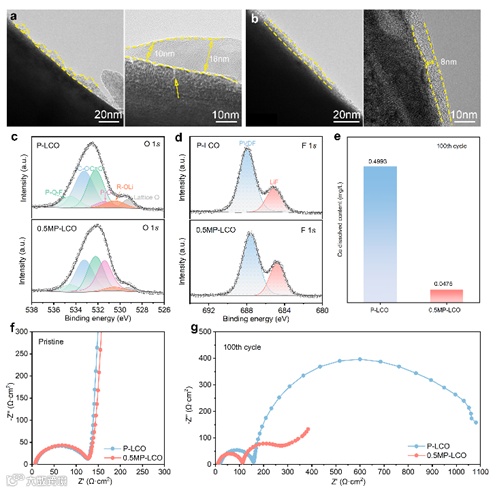 循环后,P-LCO颗粒的表面被不完整且不均匀的CEI覆盖,部分区域裸露,部分区域厚度超过18 nm,同时在表面还可以检测到微裂纹。相比之下,0.5MP-LCO被均匀且薄的CEI覆盖,能够保护LCO的高活性表面。同时0.5MP-LCO中无机成分的含量要比P-LCO中高得多,能够经受长期的循环测试。表面副反应还会导致钴溶解。经过200次循环,P-LCO中的钴溶解量约为0.5MP-LCO的10倍,进一步证实了表面化学重构过程可以形成LCO的高电压稳定表面,以减少表面副反应并抑制LCO中的钴溶解。