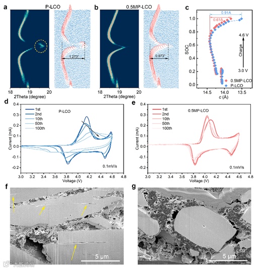 为了了解表面重构对4.6 V下钴酸锂结构稳定性的影响,进行了原位XRD测试。P-LCO显示出从O3相到H1-3相的相变,晶格参数剧烈变化,这将破坏层状结构。相比之下,0.5MP-LCO中的不利相变被有效抑制。循环后的P-LCO颗粒中观察到了两种类型的微裂纹,包括颗粒内部的裂纹和从表面向内部延伸的裂纹。相比之下,0.5MP-LCO保持其形态完整,没有可见的微裂纹。