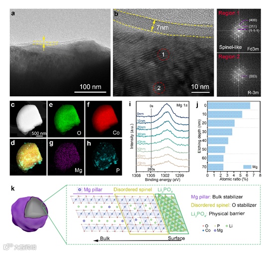 通过高温处理,LCO与MP发生反应。XPS测试表明0.5MP-LCO表面存在Li3PO4。TEM表明0.5MP-LCO在表面展示出明显的复合结构。颗粒的最外层呈均匀的非晶层,厚度约为7 nm,根据XPS和XRD分析,可以推断为结晶较差的Li3PO4。FFT图像证明次外层为新形成的类尖晶石层,类尖晶石结构具有更稳定的氧框架和较高的氧阴离子氧化还原电压,可作为氧稳定层。XPS深度剖析实验表明Mg扩散进体相且呈梯度分布。
