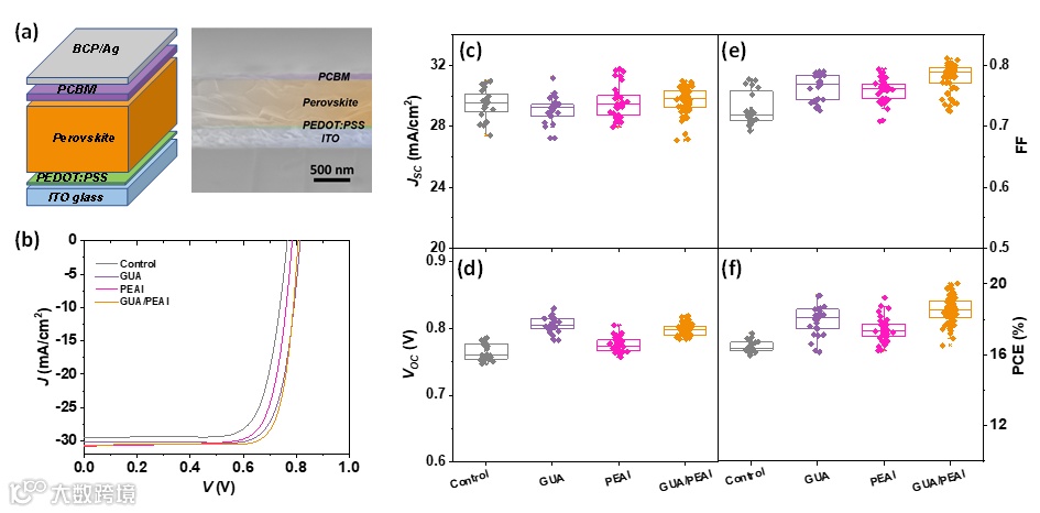图4. (a) 倒置器件的结构和横截面扫描电子显微镜图像。(b) 具有单一和二元配体的PSC的J-V曲线。性能参数的箱线图包括 (c) JSC,(d) VOC,(e) FF 和 (f) PCE。