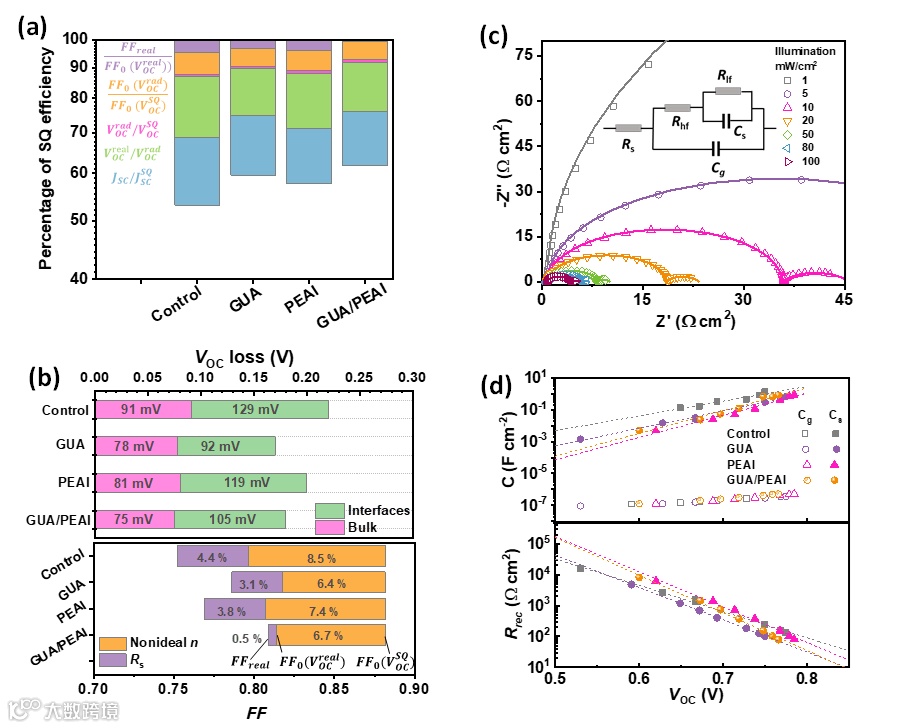 图5. (a) 不同配体的器件的详细平衡效率限制百分比,分为光电流损失 (JSC/JSCSQ)、辐射和非辐射电压损失 (VOCrad/VOCSQ, VOCreal/VOCrad) 以及由非辐射复合和电阻引起的填充因子损失 (FF0(VOCreal)/FF0(VOCSQ) 和 FFreal/FF0(VOCreal))。(b) 来自体相和界面的VOC损失以及来自非理想n (非辐射复合) 和串联电阻的填充因子损失百分比。(c) 在不同照射强度下以开路条件测量的GUA/PEAI样品的Nyquist图,插入了用于拟合阻抗数据的等效电路。开放点是原始数据,实线曲线是拟合结果。(d) 在不同照射强度下测量的电容和复合电阻(Rhf和Rlf之和)与线性拟合结果。