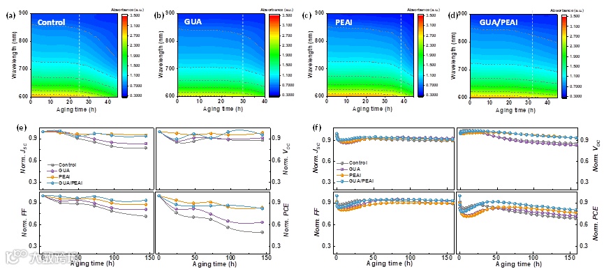 图6.(a)对照组、(b)GUA薄膜、(c)PEAI薄膜和(d)GUA/PEAI薄膜在1个太阳照射下老化的吸光度曲线。在以下条件下,(e)在氮气保护箱内在黑暗中降解,以及(f)在1个太阳强度的连续LED照明下(在短路条件下且没有任何光学滤光片),记录器件性能的标准化值(平均JSC、VOC、FF和PCE,来自6个电池)。