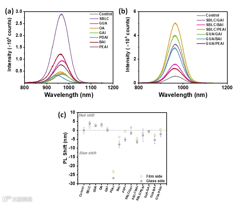 图3. 具有(a)单配体和(b)二元配体的钙钛矿/玻璃薄膜的光致发光谱。(c)不同钙钛矿薄膜的发射峰位移。