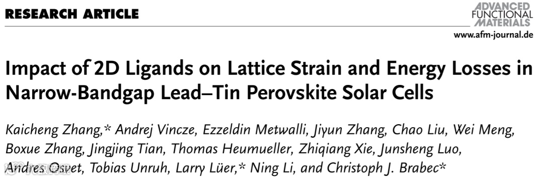 近日,来自埃尔朗根-纽伦堡大学的Christoph J Brabec教授与华南理工大学的李宁教授合作,在国际知名期刊Advanced Functional Materials上发表题为“Impact of 2D Ligands on Lattice Strain and Energy Losses in Narrow-Bandgap Lead–Tin Perovskite Solar Cells”的文章。该文章研究了二维配体在Pb/Sn PSC中的应变调控和缺陷钝化机制。这些二维配体包括具有长烷基链的电中性阳离子(LAC)、相对较短烷基链的碘酸盐(SAC)及其混合物。研究结果显示,LAC配体有助于松弛钙钛矿薄膜的拉伸应变,而SAC配体会引起应变积累。通过混合LAC/SAC配体,钙钛矿薄膜的拉伸应变可以平衡,从而提高太阳能电池的性能。添加了β-胍基丙酸(GUA)/苯乙胺碘化物(PEAI)的PSC表现出增强的开路电压和填充因子,这归因于减少了体内和界面处的非辐射复合损失。此外,混合二维配体还略微提高了PSC的运行稳定性。该研究揭示了二维配体在应变调控和缺陷钝化方面对于高效稳定的窄带隙PSC的机制。
