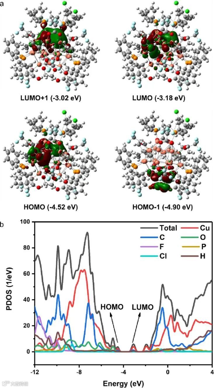 Cu26团簇的11个氢化物是通过在晶体学数据差电子密度图中的残峰确定的位置。分别为方锥体型(μ5-H),四面体型(μ4-H)和蝴蝶型(μ4’-H)。为了进一步了解Cu26团簇的电子结构,确定氢化物位置的合理性,对Cu26团簇进行几何优化和电子结构计算。通过理论计算得出HOMO和LUMO轨道之间的能隙为1.34 eV,与相应的偏态密度(PDOS)非常吻合。我们对比了其他前沿轨道的电荷密度,与实验数据吻合较好,说明所采用的几何结构是合理的。