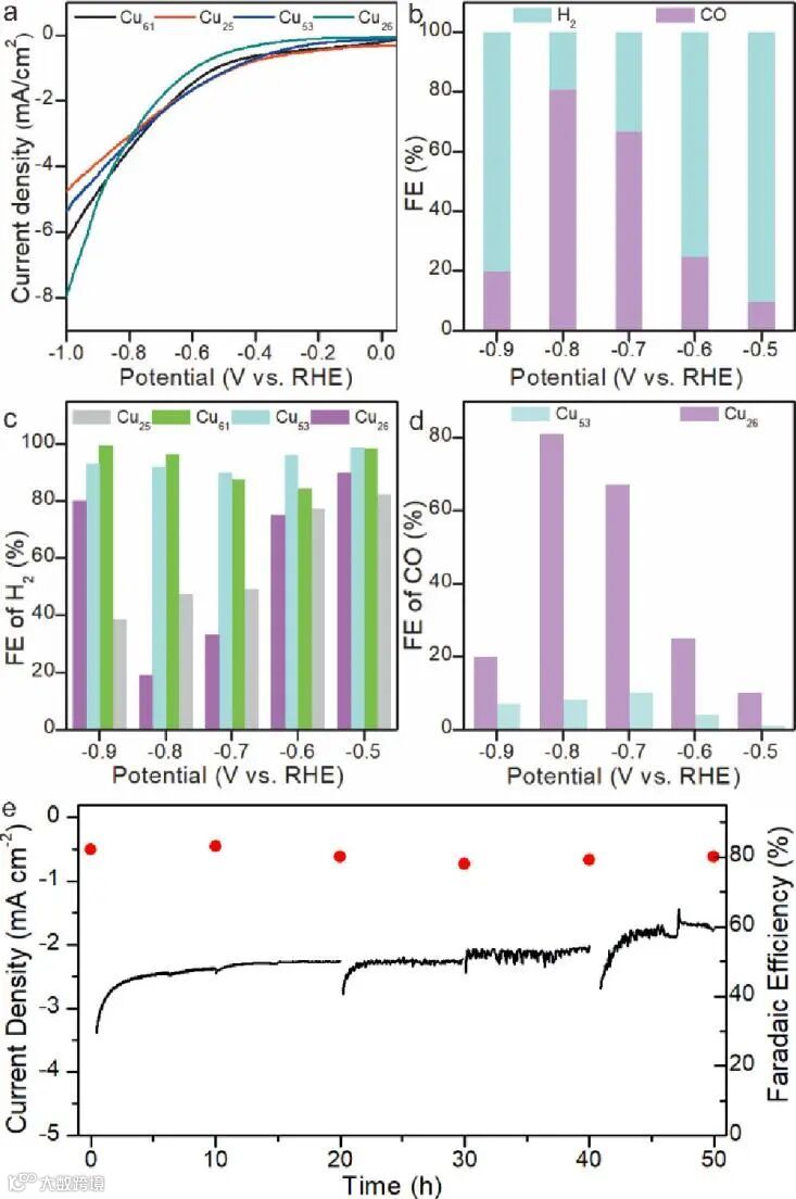 由于铜基材料是电催化CO2还原成高价值化学品的重要催化剂,作者把Cu26团簇作为催化剂应用到电催化CO2还原中,发现其有很好的活性和选择性以及高的稳定性(图5)。Cu26团簇表面五类配体精确及其平衡的配位模式、成键能力和立体化学因素赋予了该团簇具有独特的几何排列和独特的电子结构。正是由于该团簇的结构使其成为电化学还原CO2到CO的高性能催化剂,进一步使其成为激发表面工程优化Cu基纳米催化剂性能的模型体系。