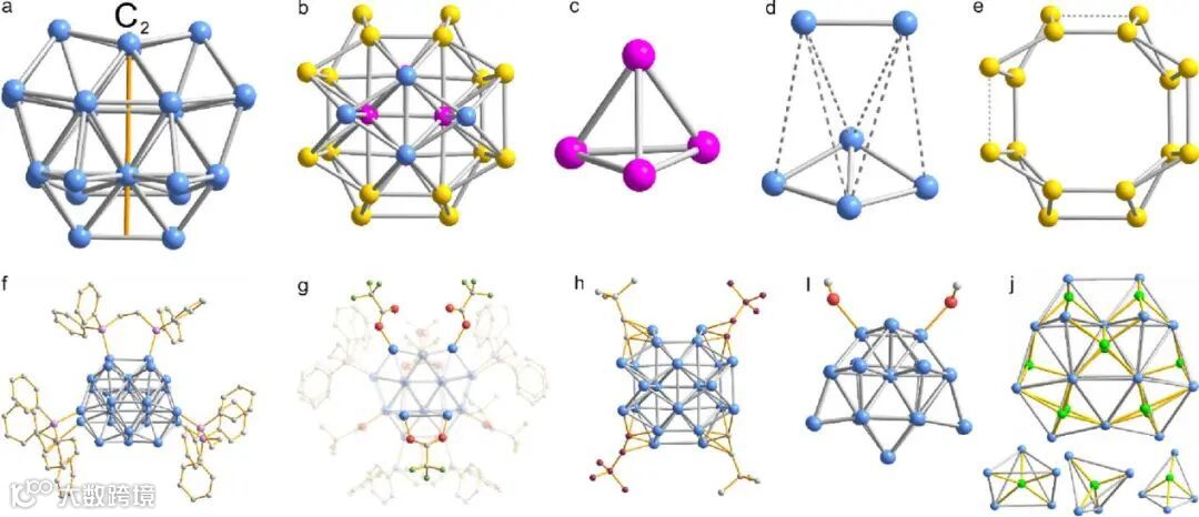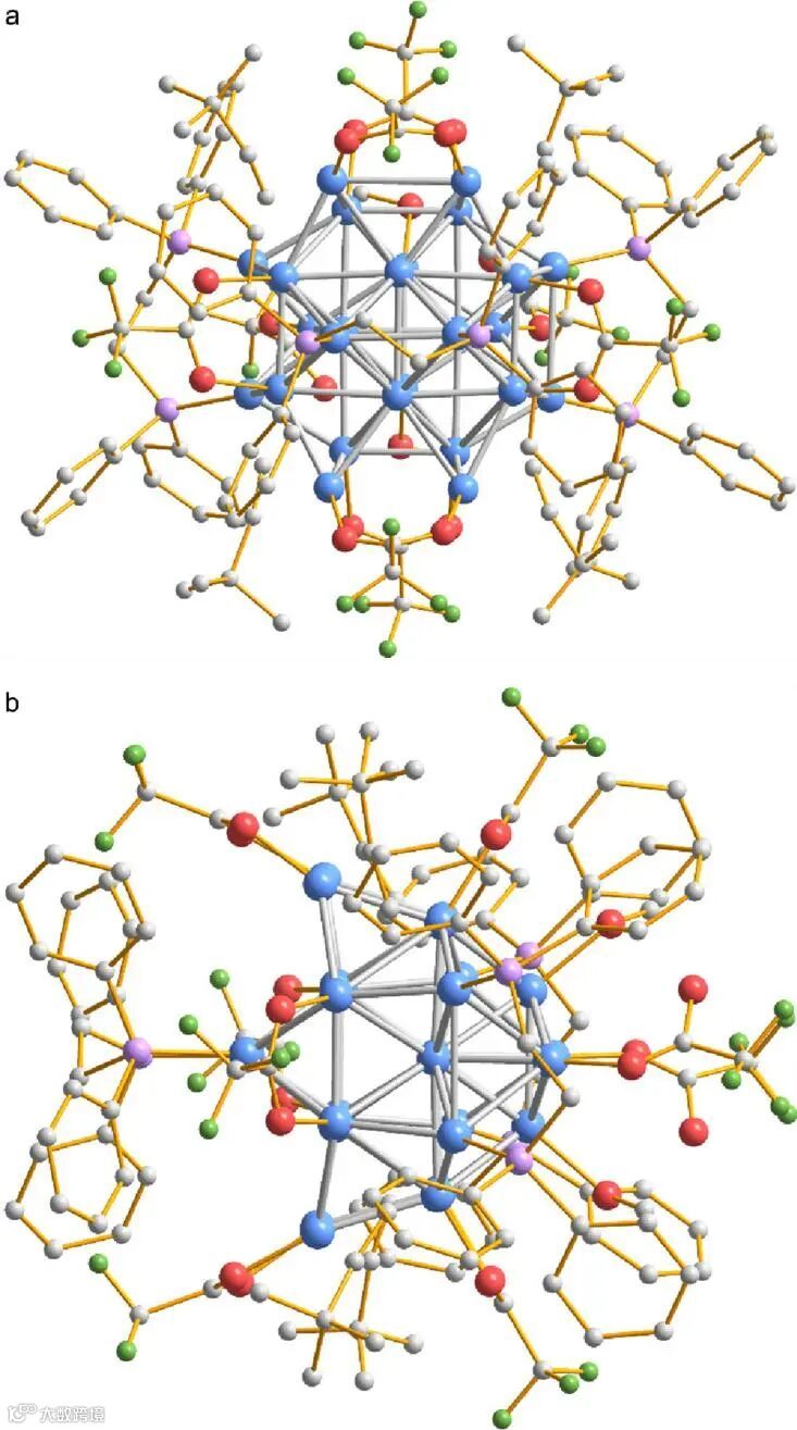 Cu26纳米团簇是由膦、炔基、羧酸、醇、氢化物等5种配体保护,分子式为[Cu26(DPPE)3(CF3CO2)8(CH3O)2(tBuC≡C)4H11]+ ,显示了其在复杂铜纳米材料表面配位结构上的独特性。该团簇的整体结构如图1所示,团簇的总结构可以看作是一个帽状的核,由一个独特的配体外壳包围,形成一个迷人的孤立结构。团簇表面配体的配位模式如图2所示,多个表面配体的协同效应不仅稳定了金属核,而且对于诱导形成的团簇的成核类型也至关重要。