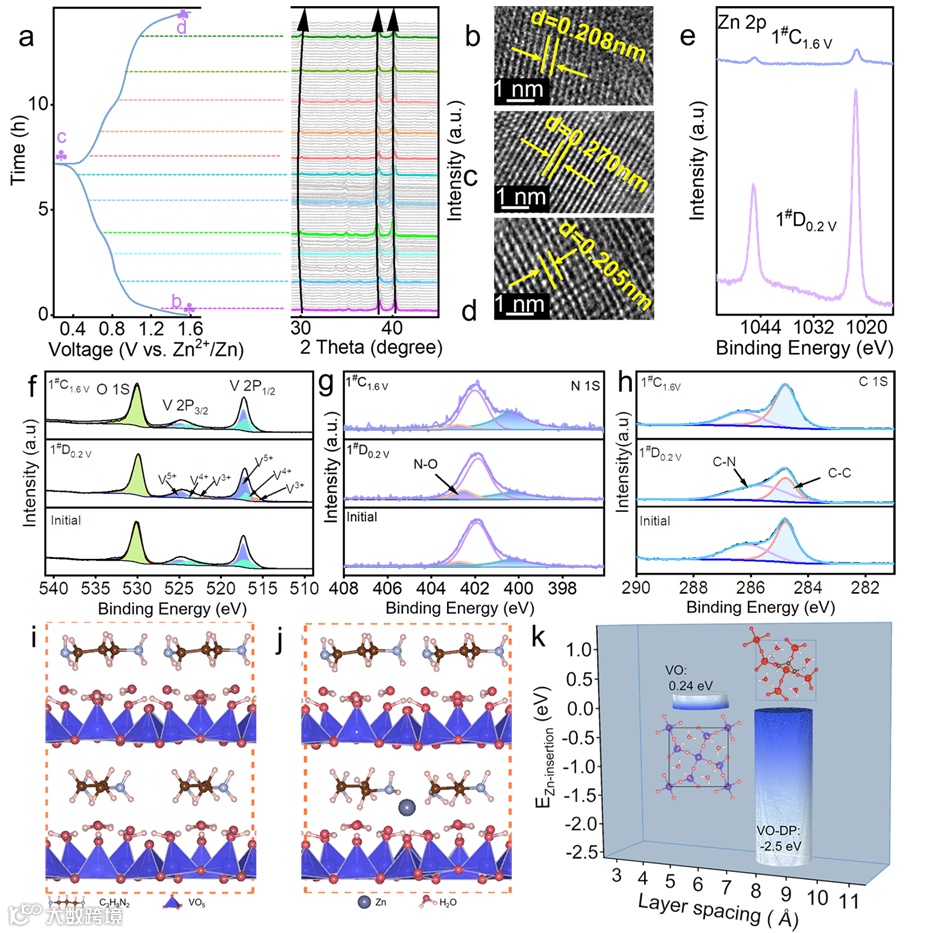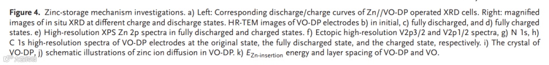 图4探究锌离子储存机制。图四从充放电过程中,VO-DP的相变得到了其不仅结构稳定还具有电化学可逆性好的结论。理论计算也从侧面验证了DP的引入更有利于锌离子在钒氧层间的脱嵌。