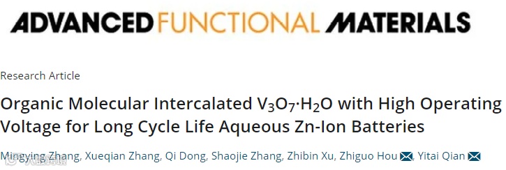 近日中国科学技术大学钱逸泰院士和侯之国研究员在知名期刊Advanced Functional Materials上发表了题为“Organic Molecular Intercalated V3O7·H2O with High Operating Voltage for Long Cycle Life Aqueous Zn-Ion Batteries”的文章。本文提出了一种高效钒基次阴极设计策略。该策略可以有效解决钒基材料由于工作电压平台较低所导致的能量密度低。