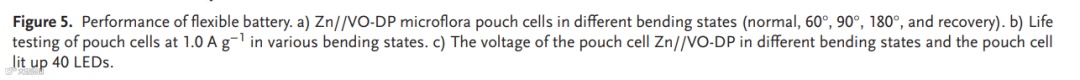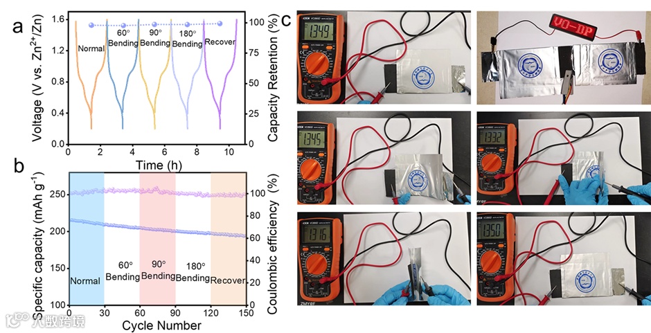 图5 为了进一步验证其在柔性电池中的应用潜力。组装好的柔性电池在不同弯曲状态下的连续恒流充放电测试显示出稳定的充放电曲线,表明具有良好的柔韧性和折叠能力。在1.0 A g−1电流密度下的充放电测试也证实了其长寿命和可靠的灵活性(150次循环后容量保持率为90.69%)。此外,包装良好的小袋电池在充满电的情况下,也能在各种弯曲状态下保持稳定的电压。