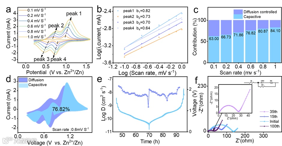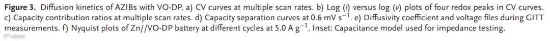 图3介绍了VO-DP的反应动力学。从图3可以看出离子迁移率高,证实了DP的引入,更有利于锌离子在钒氧层间的嵌入\脱嵌行为。