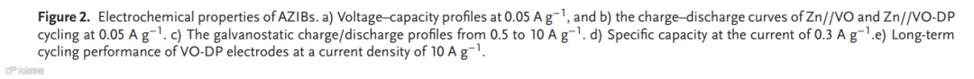 图2介绍了VO-DP的电化学性能。与对比样相比,VO-DP的工作电压平台与比容量都有明显的提高,且不论在大电流密度还是小电流密度下,其电化学性能都比较优异。