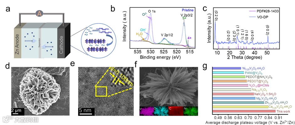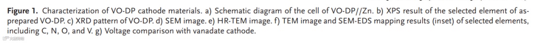 图1介绍了合成的VO-DP的物质组成和其形貌。并对比了VO-DP与其他钒氧化物的平均工作电压。