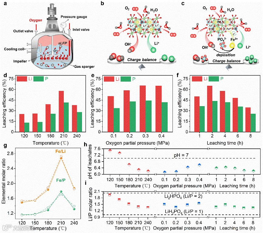 图1 (a)浸出设备示意图;(b)氧还原生成的氢氧根作为内建阴离子与浸出Li+的平衡示意图;(c) 氧还原生成的氢氧根和磷酸铁锂释放的磷酸根阴离子与Li+的平衡示意图;不同(d)温度、(e)氧分压、(f)浸出时间下废旧磷酸铁锂的浸出行为;(g)不同温度下得到的浸出渣中Fe/Li和Fe/P摩尔比实际值(实线)和理论值(虚线);(h)不同条件下浸出液的pH值和(i) Li/P摩尔比。