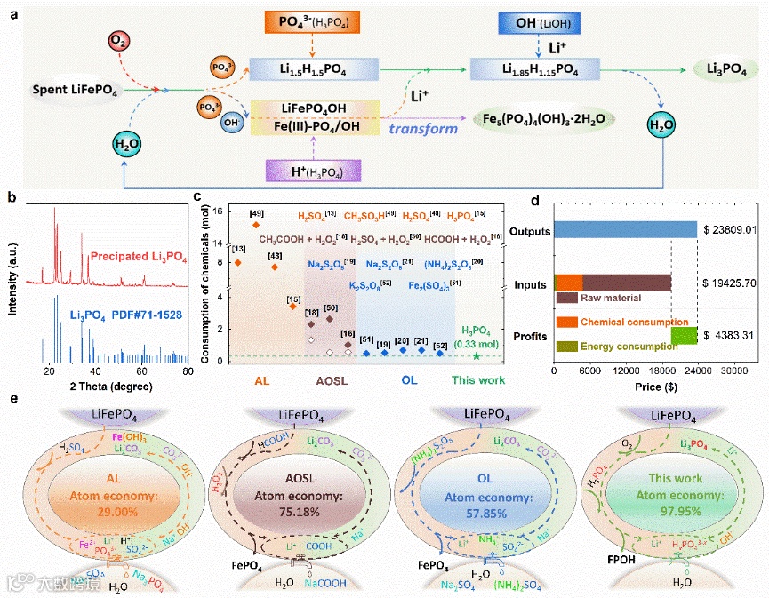 图5 (a)内建阴离子平衡策略回收废旧磷酸铁锂的示意图;(b)磷酸锂产物的XRD谱图;与传统湿法冶金过程的(c)浸出酸耗、(d)回收经济性分析及(e)回收过程原子经济性比较。