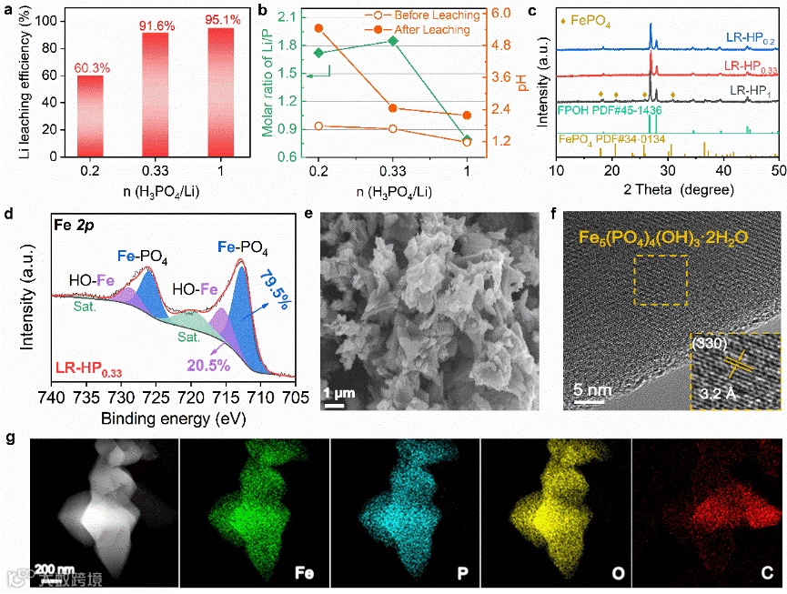 图4 添加定量磷酸后滤液及滤渣的表征。(a)锂的浸出效率;(b) Li/P元素摩尔比与溶液pH;(c)不同H3PO4配比浸出渣的XRD谱图;(d) LR-HP0.33样品Fe 2p轨道的高分辨XPS谱,(e) SEM,(f) TEM,(g) Fe、P、O、C元素的EDS图。