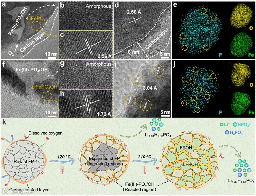 图3 LR-120和LR-210样品的微观结构表征。(a-d) LR-120的TEM图像;(f–i) LR-210的TEM图像;(e) LR-120和(j) LR-210的P、O和Fe的EDS元素图谱;(k) 磷酸铁锂在氧压下去离子水中的浸出机理示意图。