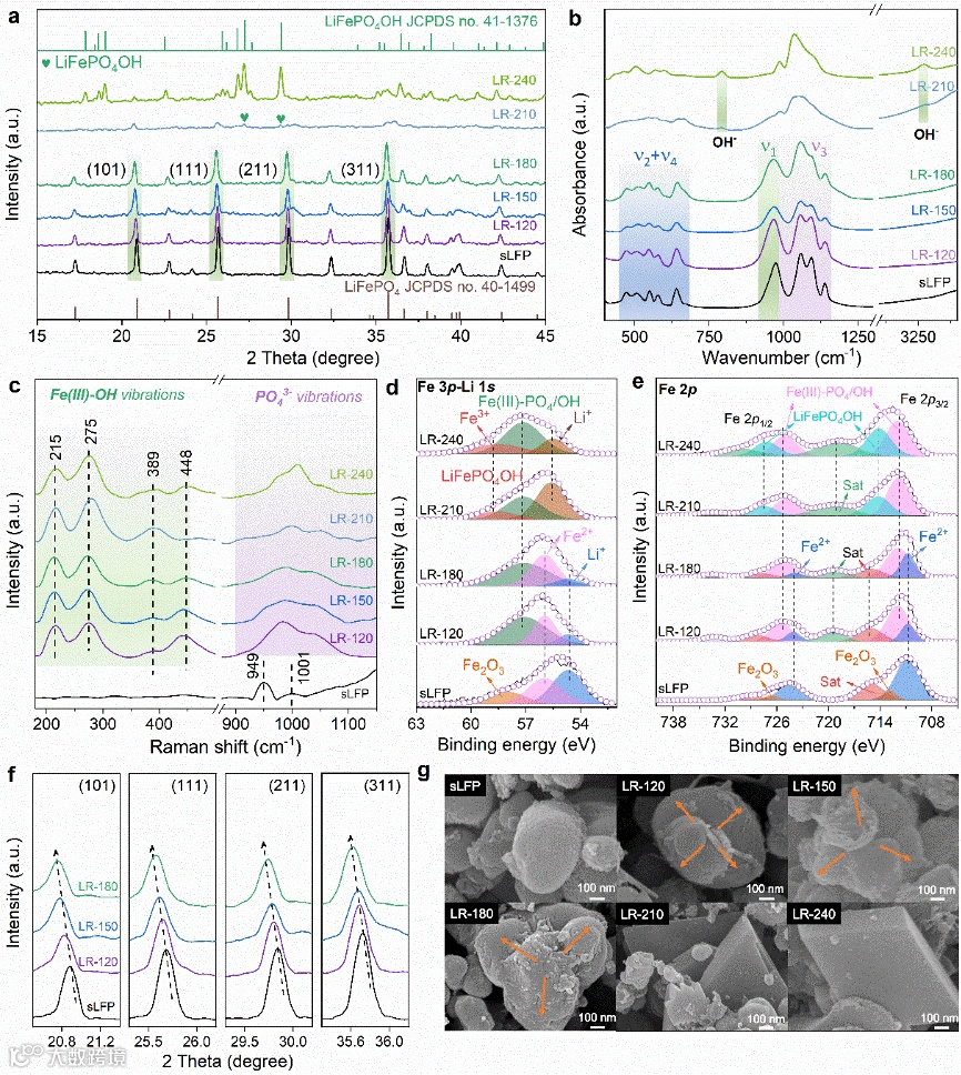 图2 废料及不同温度下浸出渣的(a)XRD图谱、(b) FT-IR和(c)拉曼光谱;(d) Fe 3p-Li 1s和(e) Fe 2p高分辨率XPS谱;(f)(101)、(111)、(211)和(311)衍射峰放大图和(g)SEM图像。