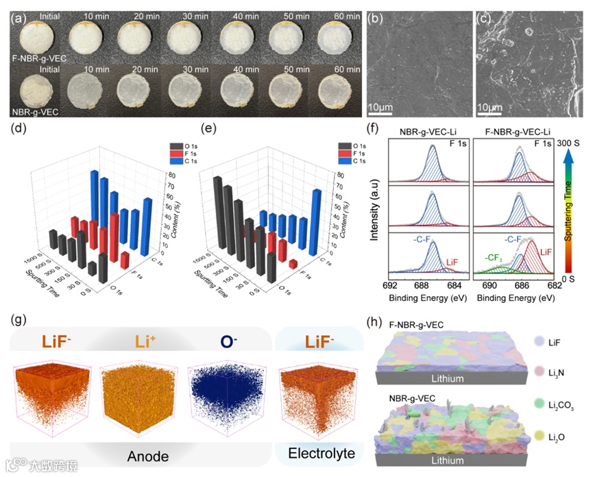 开发了一种气相氟化方法在橡胶衍生的弹性电解质上构筑亲锂富氟表面,通过电化学过程形成化学键接的弹性、超薄、完整的富LiF超共形界面层。